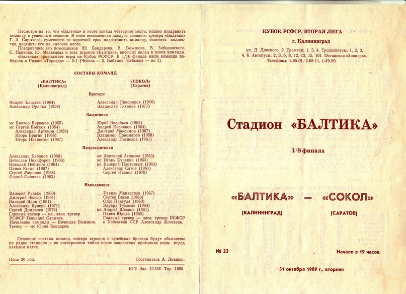 1989 год. 1/8 финала Кубка России для команд второй лиги: «Балтика» - «Сокол» (Саратов) 1-1 по пенальти 8-7. 10700 зрителей.